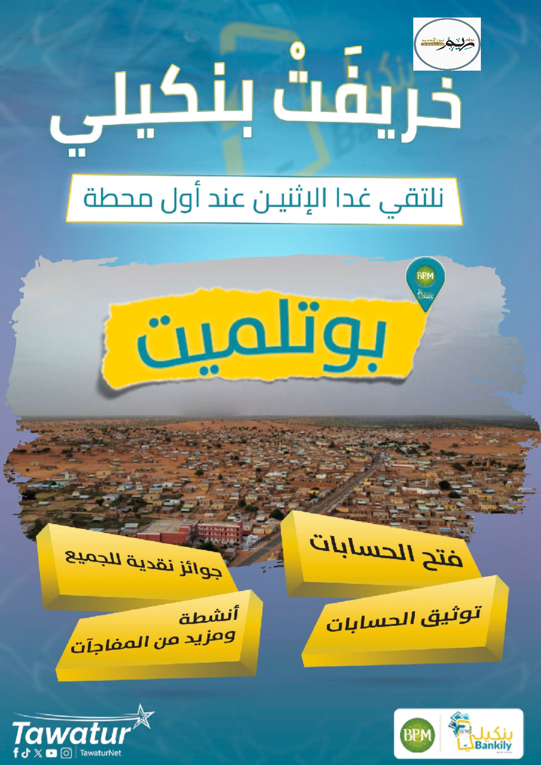 أطلق البنك الشعبي الموريتاني جولة ميدانية تحت شعار “خريفة بنكيلي”، تهدف إلى تعزيز القرب من المواطنين وتقديم خدمات مصرفية مباشرة في أجواء ترفيهية مصحوبة بأنشطة وجوائز.